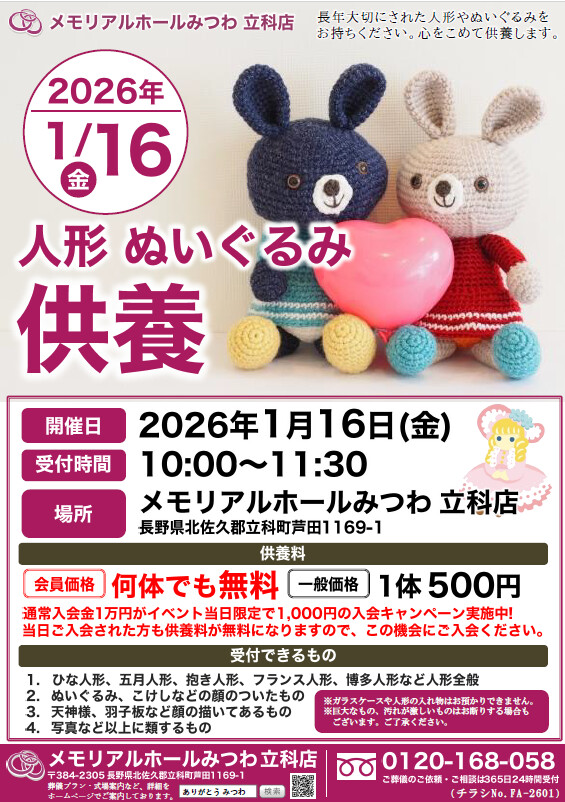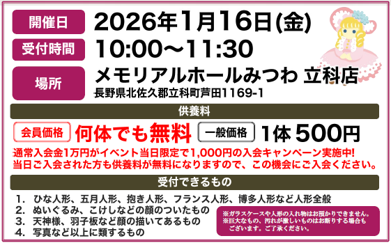 1月16日人形供養祭開催のお知らせ!|北佐久郡の葬儀・お葬式なら家族葬のみつわ