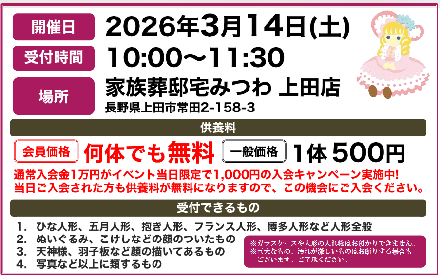 3月14日(土)にみつわ上田店で人形供養祭を開催いたします!