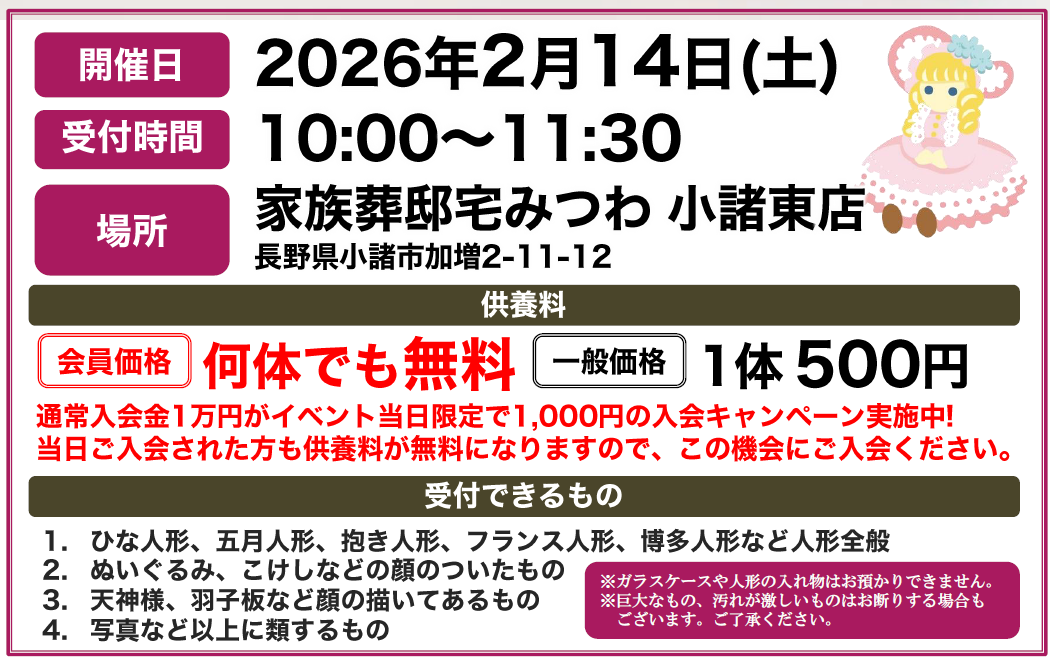 2月14日(土)小諸東店で人形・ぬいぐるみ供養祭を開催いたします。|小諸市の葬儀・お葬式なら家族葬のみつわ