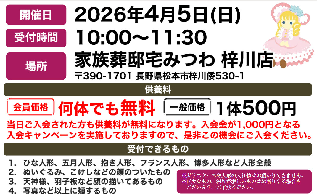 4月5日(日)にみつわ梓川店で人形供養祭を開催いたします!