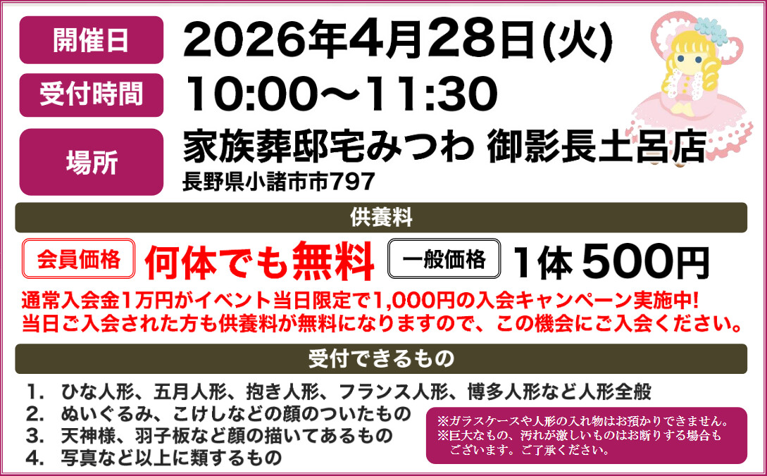 4月19日(日)に御影長土呂店で人形供養祭を開催いたします!