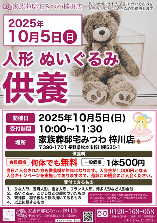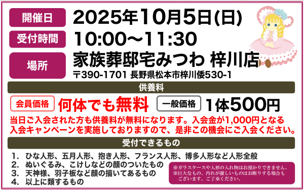 10月5日にみつわ梓川店で人形供養祭を開催いたします!