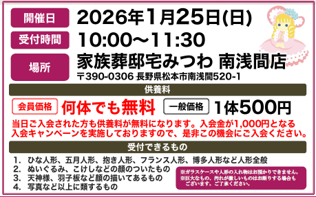 1月25日(日)にみつわ南浅間店にて人形・ぬいぐるみ供養祭を開催いたします。人形やぬいぐるみをそのまま捨てるのは心苦しいと感じる方は是非人形・ぬいぐるみ供養祭をお越しください!長年寄り添った人形やぬいぐるみと供養という形でお別れすることで心の負担を軽減しながらお別れすることができます。こちらの人形・ぬいぐるみ供養祭はみつわ会員の方は無料でご利用いただけますが、一般の方は1体につき500円の料金を頂戴いたします。
