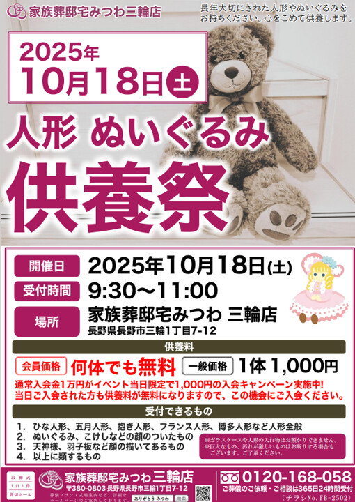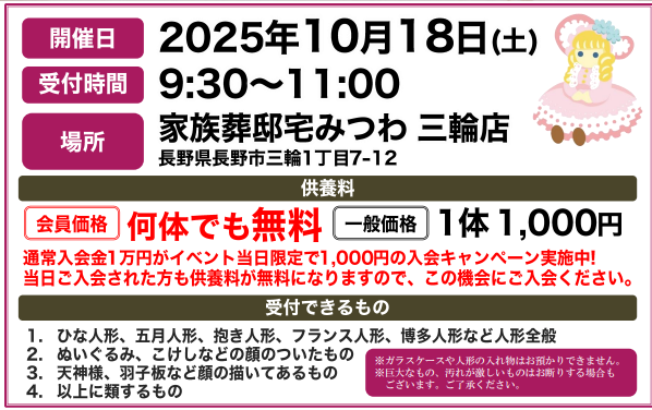 10月18日にみつわ三輪店で人形供養祭を開催いたします!