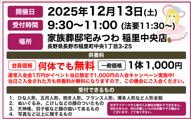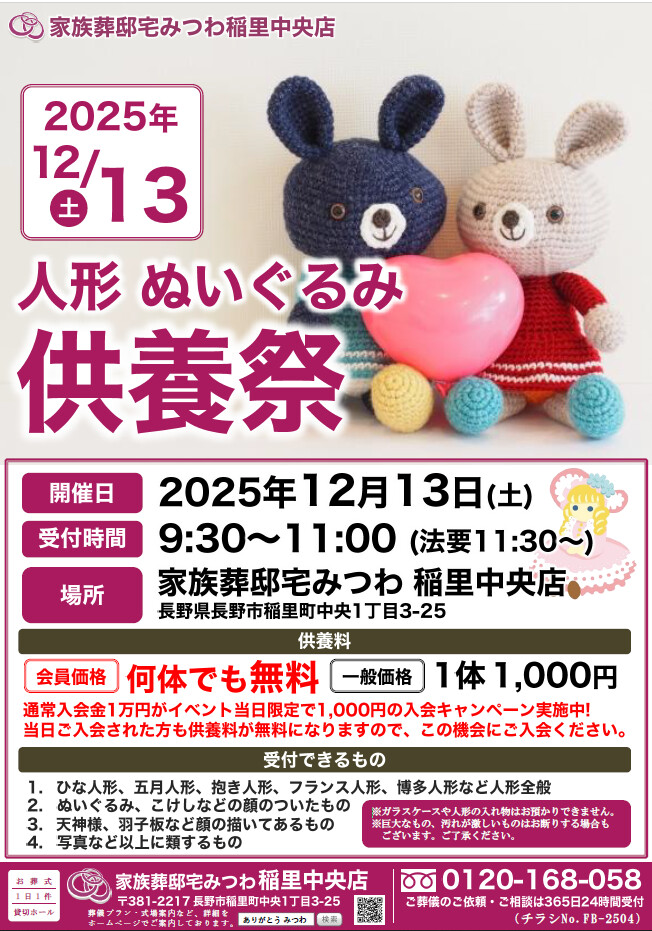 12月13日(土)にみつわ稲里中央店にて人形・ぬいぐるみ供養祭を開催いたします。人形やぬいぐるみをそのまま捨てるのは心苦しいと感じる方は是非人形・ぬいぐるみ供養祭をお越しください!長年寄り添った人形やぬいぐるみと供養という形でお別れすることで心の負担を軽減しながらお別れすることができます。こちらの人形・ぬいぐるみ供養祭はみつわ会員の方は無料でご利用いただけますが、一般の方は1体につき1,000円の料金を頂戴いたします。