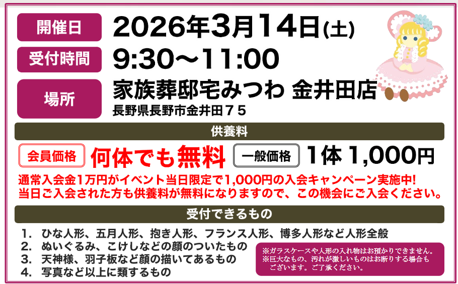 3月14日(土)にみつわ金井田店で人形供養祭を開催いたします!