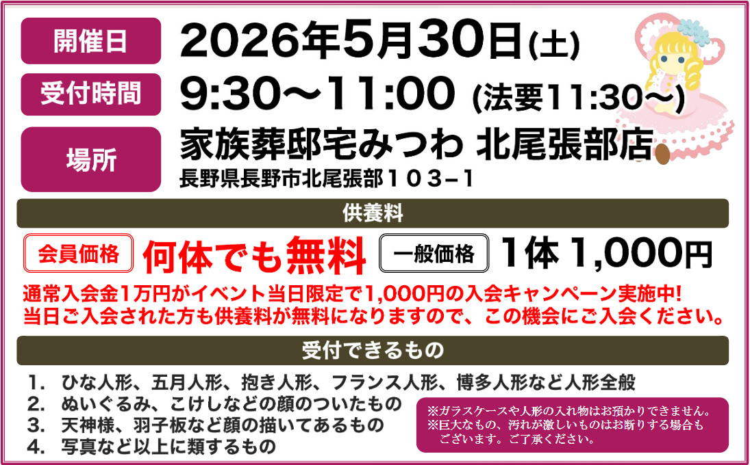 5月30日(土)みつわ北尾張部店で人形・ぬいぐるみ供養祭を開催いたします。|長野市の葬儀・お葬式なら家族葬のみつわ