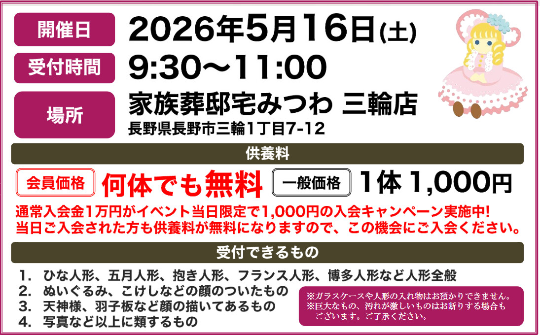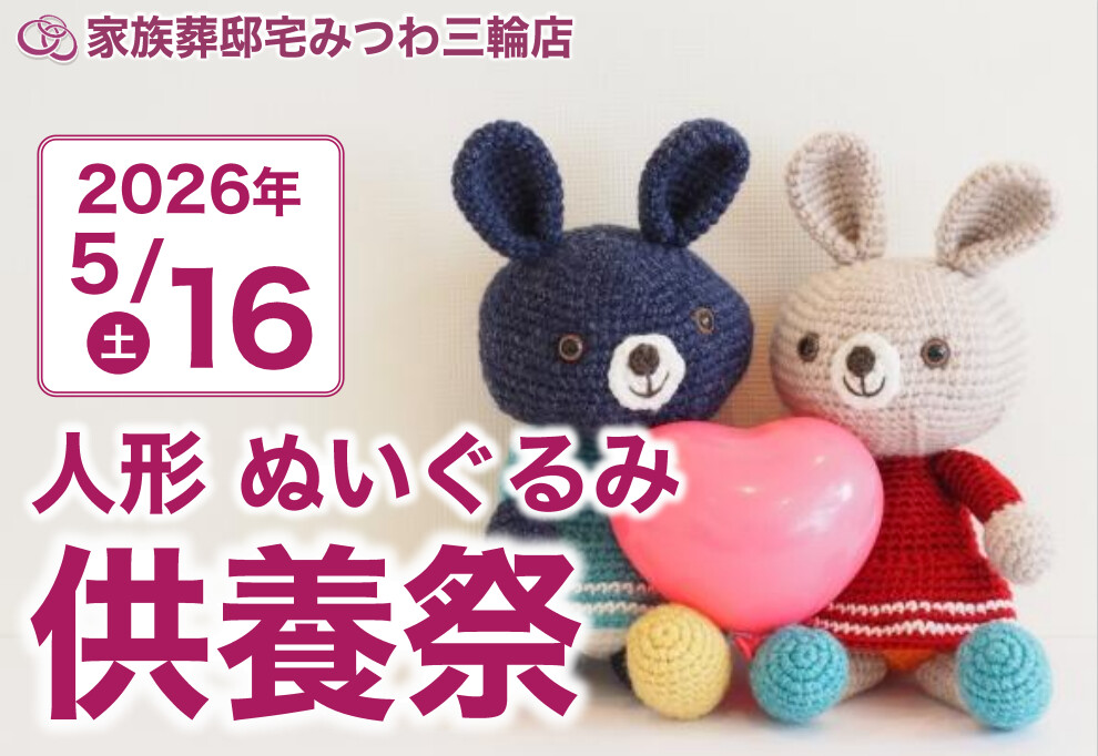 5月16日(土)みつわ三輪店で人形・ぬいぐるみ供養祭を開催いたします。|長野市の葬儀・お葬式なら家族葬のみつわ