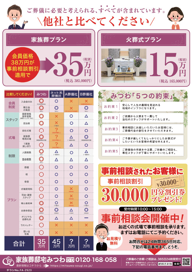 家族葬のみつわには葬祭ディレクター技能審査協会実施の技術審査(厚生労働省認定)に合格した葬祭ディレクターが多数在籍しています。葬祭業界で働くための知識と技能を評価する制度で、品質の高いサービスを提供するために必要不可欠な資格です。私たち葬儀の専門スタッフが心を込めてお手伝いいたしますので、安心しておまかせください。