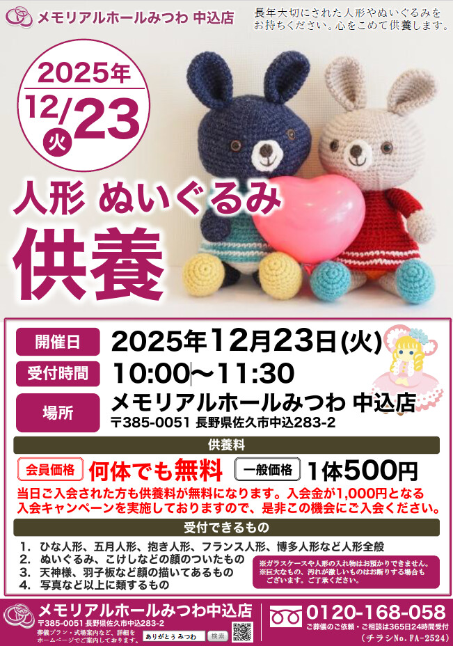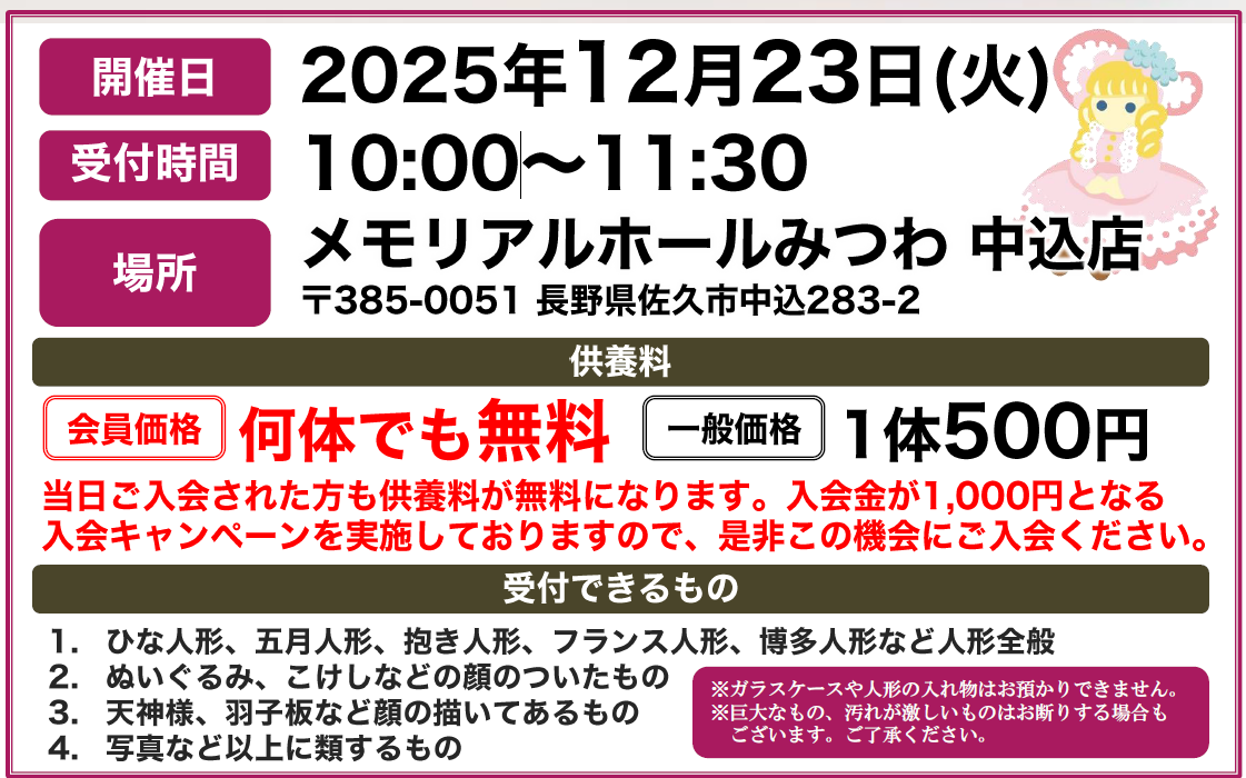 12月23日(火)にみつわ中込店で人形供養祭を開催いたします!