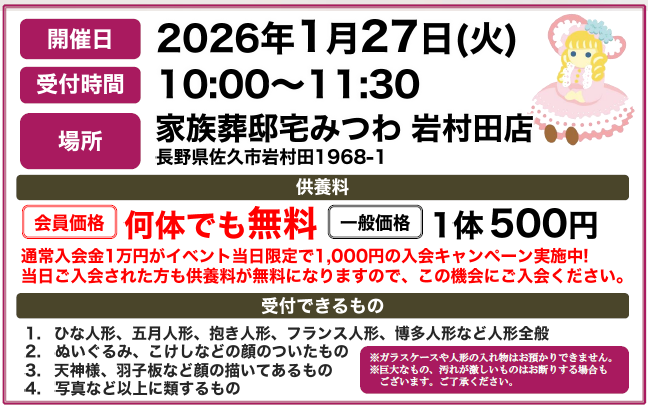 1月27日にみつわ岩村田店で人形供養祭を開催いたします!