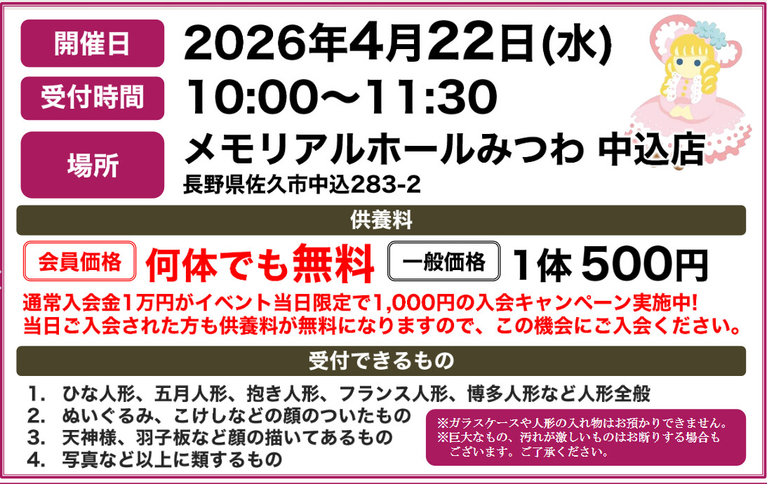 4月22日(水)にメモリアルホールみつわ中込店で人形供養祭を開催いたします!