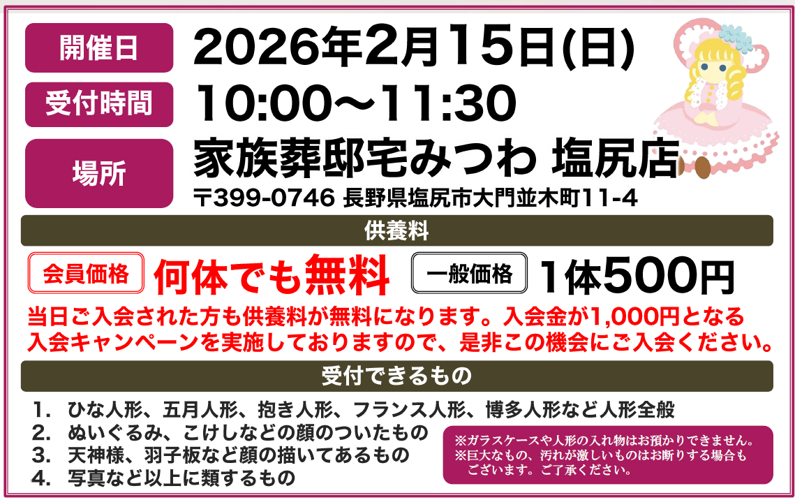 【塩尻店】2月15日(日)、人形・ぬいぐるみ供養祭を開催!| 入会キャンペーンを同時開催します!|塩尻市の葬儀・お葬式なら家族葬のみつわ