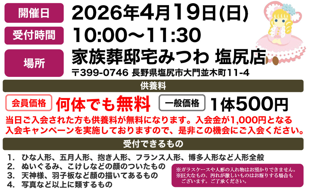 4月19日(日)にみつわ塩尻店で人形供養祭を開催いたします!