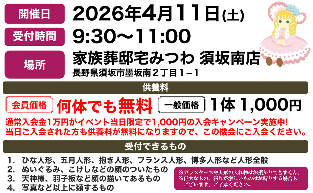 4月11日(日)にみつわ須坂南店で人形供養祭を開催いたします!