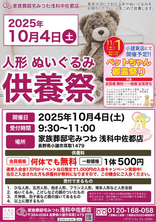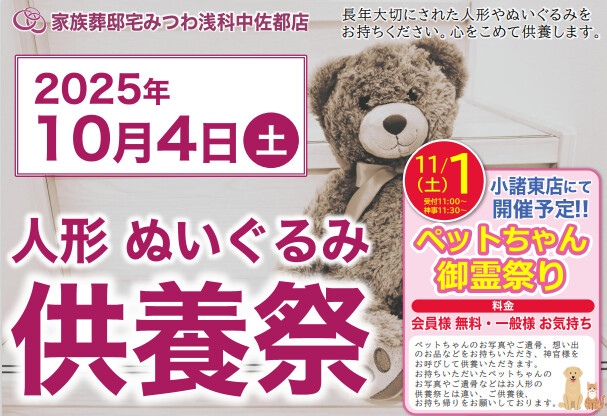 10月4日にみつわ浅科中佐都店で人形供養祭を開催いたします!