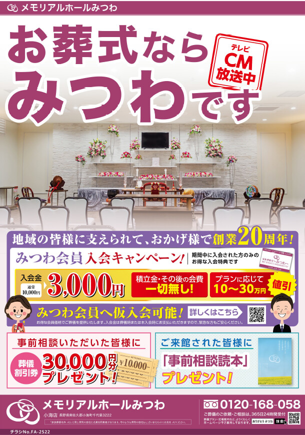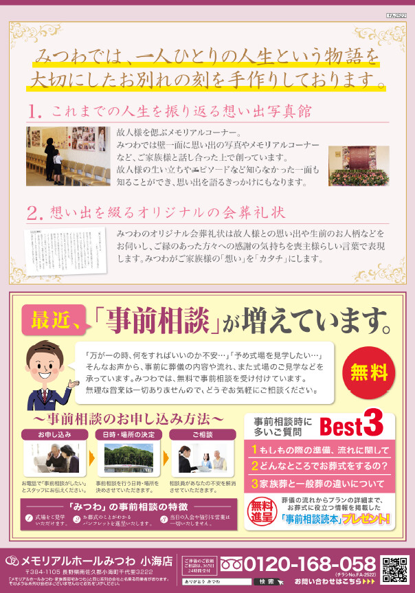 家族葬邸宅みつわでは佐久・小諸で11式場を運営しております!よりいい葬儀を行うために各式場では無料の事前相談を受け付けております。葬儀に関わる疑問点や費用はみつわの事前相談で解決しましょう!